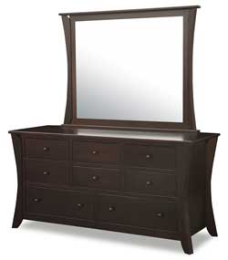 ![]() Caledonia Contemporary 8 drawer dresser in solid brown maple with espresso stain. Flowing curved lines that blend with the modern mission style. Reverse panels and flush mount drawers lead to a smooth creative feel |