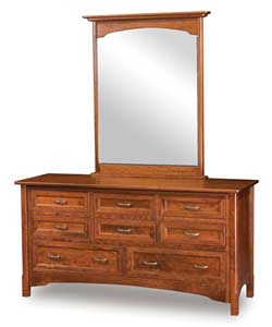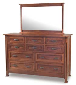 ![]() Amish custom hand crafted Pasadena Mission 9 drawer dresser in quarter sawn white oak with michaels cherry stain. This mission dresser showcases angled sides on both the dresser and mirror. |