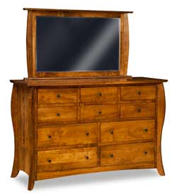 ![]() Quincy 10 drawer Mule Dresser crafted in solid Brown Maple with a Light Asbury Brown Stain. Shown with optional Quincy Mirror. Arched legs and flush mount drawer are standard. |