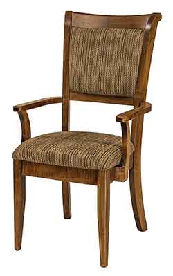 ![]() Our timeless Amish made Kalispel Formal SArm dining chair shown handcrafted out of solid brown maple with a Kona stain. |