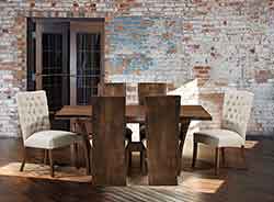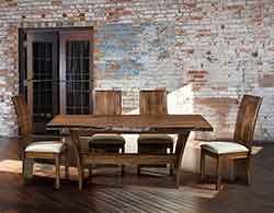 ![]() Complete Evergreen Formal Dining room shown Amish handcrafted out of solid wormy maple with worn spice stain and rhineston fabric seats. |