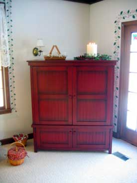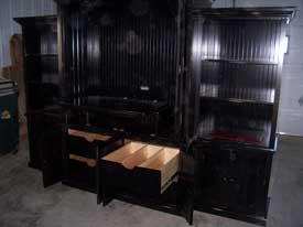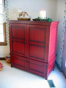![]() Brown Maple with Black Paint Entertainment Center with Bead Board Back and Red Leather Inserts |