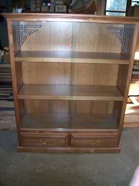 ![]() Maple Bookcase with Sliding Front Doors and Celtic Glass Etching |