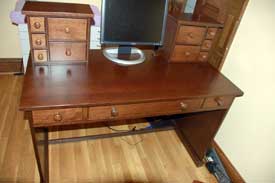 Desks can be made as standard flat top desks, elaborate hutch desks, gorgeous roll tops, and computer armoires. We work hard to make sure you get the heirloom quality piece that you deserve for your home office. All of our desks are made from the highest quality solid hardwoods using time honored construction methods such as dove tail drawers and hand rubbed stains.