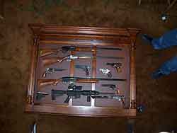 The rest of the pictures are some different configurations we played around with and some detail photos of the moldings. We found that we could place a wide array of rifles, shotguns, and pistols into the display. If you have a gun collection contact one of our Amish custom furniture specialists and we will help you create the perfect wall mounted gun display. |